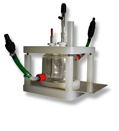 The cell consists of a base plate, a plastic ring with an inserted O-ring, a double-walled glass vessel with 2 GL18 connections for heating, two connections for leak-free separation of the heating hoses, a cover, an Ag/AgCl reference electrode with an intermediate vessel as a Haber Lugging capillary, and an L-shaped counter electrode made of platinum-coated titanium.