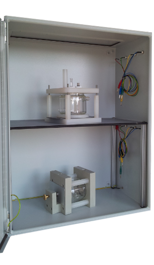 For high voltage applications the cage serves as protection against direct contact to the dangerous voltage of the device. For such applications the faraday cage is equipped with a circuit breaker.