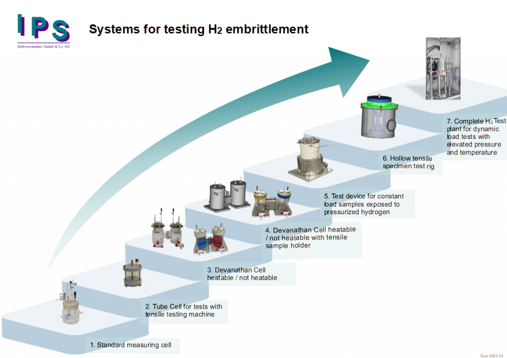 From the current perspective, the most sophisticated stage of such a testing system is a plant consisting of a tensile testing machine (preferably servo-hydraulic), an autoclave (20l and more) with a built-in load frame, an enclosure with ventilation (for collecting the escaping hydrogen), a gas management system and a safety-related PLC.