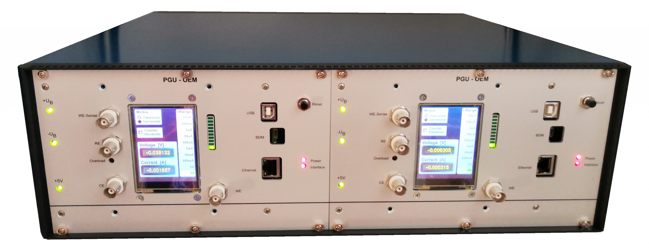 Eine Sonderausführung ist PGU-OEM-H2 für Permeationsexperimente mit zwei Modulen, eines für die Oxidationsseite und eines für die Ladeseite. Beide Module sind doppelt galvanisch getrennt und können über EcmWin miteinander kommunizieren.