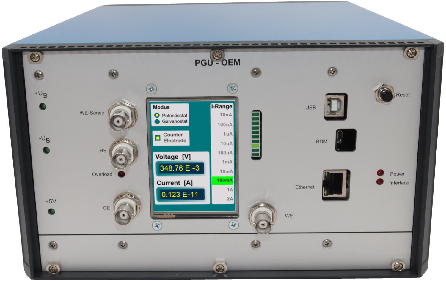 PGU-OEM ist ein variables Laborgerät für Standardanwendungen in einer Laborumgebung. Er ist als Ein- oder Zwei-Modul-Version mit einer maximalen Stromstärke von 1 oder 2 A und einem optionalen Hochgeschwindigkeits-EIS-Modul mit einem Frequenzbereich von 10 µHz bis 100 kHz erhältlich. PGU-OEM kann nur über einen Computer gesteuert werden und ist mit einem TFT-Display zur Beobachtung von Spannung, Stromstärke und Strombereich ausgestattet.